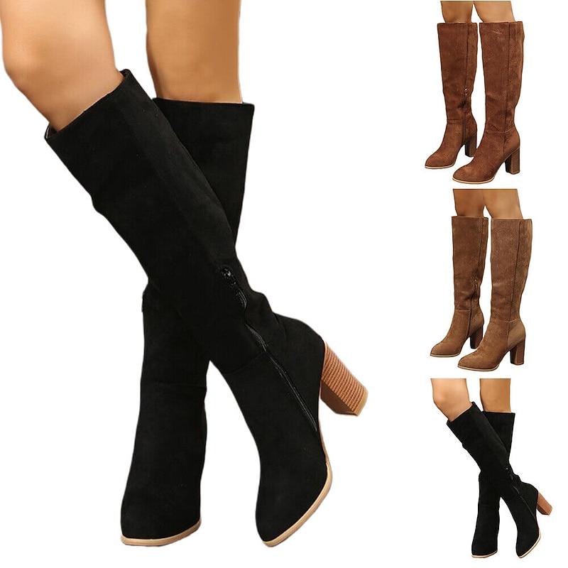 Highlights [Fabric] These knee-high boots are crafted from premium faux suede and synthetic materials, providing a soft and luxurious texture that mimics genuine leather. The rich, deep tones of black and brown offer elegance and versatility, perfect for both casual and formal settings. [Silhouette] Designed with a streamlined silhouette, these boots feature a contemporary chunky heel that adds height without compromising stability. The sleek, knee-high profile ensures a snug and flattering fit, complete with a rounded toe for enhanced comfort during extended wear. [Design Details] The boots are equipped with a full-length side zipper for easy on-and-off access, maintaining a secure fit around the calf. The minimalist design is highlighted by its solid color pattern, ensuring a classic and timeless appeal. [Occasions] Ideal for fall and winter, these boots are perfect for daily wear. Whether you're pairing them with skirts, dresses, or skinny jeans, they offer a chic and sophisticated look suitable for a variety of occasions. [Size] Available in a range of sizes from 36 to 43, these boots ensure a precise fit for a wide spectrum of foot sizes. With a mid-heel height of 2-3 inches, they provide both comfort and style, making them an essential addition to any wardrobe.