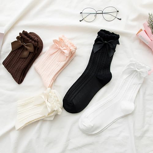 Starella 5 Pairs Women's Ruffle Frilly Socks Coquette Bow Lolita Preppy Crew Dress Sock for Girls 4