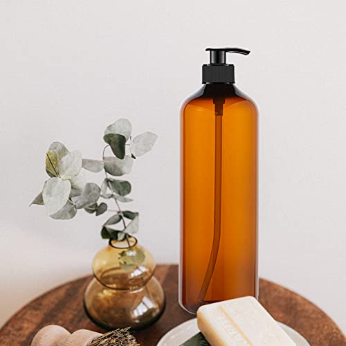 4 Pack 32 OZ Empty Plastic Pump Bottles With 1 Pen, Labels & Silicone Funnel, Amber Empty Shampoo Bottles with Pumps For Body Wash, Shampoo, Massage Lotion, Gel 6