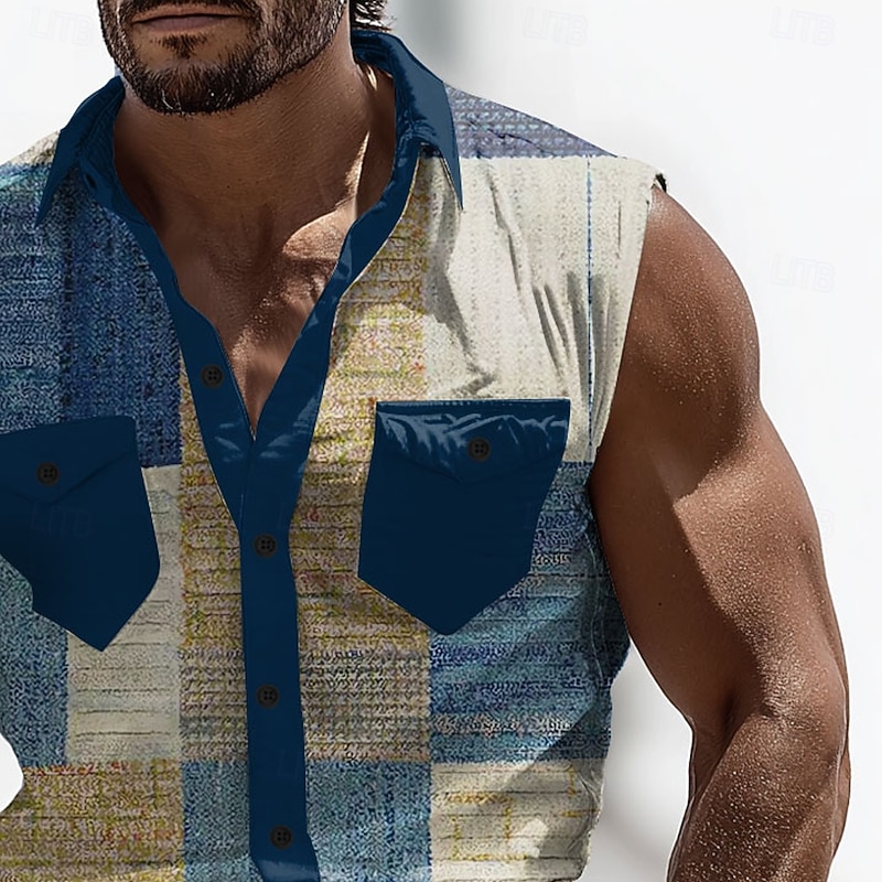 More information about Men's Color Block Patchwork Shirt Western Shirt Cowboy Shirt Sleeveless Western Style Outdoor Work Causal Summer Spring Turndown 3D Print Front Two Pockets Button Up Shirts Army Green Blue Brown
