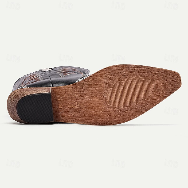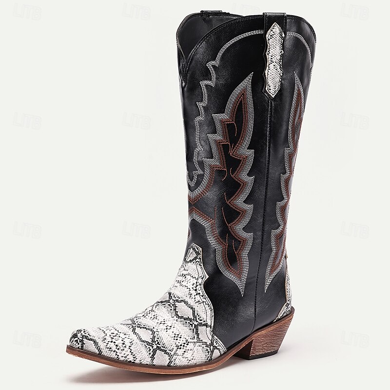 Highlights [Fabric] : Crafted with premium PU leather upper and lining, these cowboy boots offer a durable and sophisticated look. The rubber outsole provides an excellent grip, ensuring slip resistance and comfort. [Fit] : These boots feature a classic round toe shape and a loafer closure type for easy wear. The mid-height shaft and supportive design make them suitable for all-day wear, combining style with functionality. [Design Highlights] : Showcasing bold black faux leather with striking snakeskin print accents, the boots are complemented by intricate western-style embroidery for a touch of traditional allure. The stacked heel and textured foot design add a rugged yet fashionable edge. [Occasions] : Perfect for rodeos, country events, or casual outings, these boots embody a blend of rugged charm and fashionable appeal. They are versatile for various settings, whether it’s a themed event or everyday wear. [Size Range] : Available in a comprehensive range of sizes from US6-6.5 to US12, these boots cater to a wide range of foot sizes, offering the perfect fit for comfort and style.