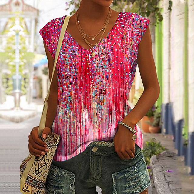 Highlights [Fabric] : Crafted from high-quality polyester, this tank top offers a lightweight and breathable feel, perfect for keeping cool and comfortable in warm weather. The micro-elasticity ensures a slightly flexible fit, allowing for ease of movement throughout the day. [Fit] : Designed with a regular fit and a casual style, this sleeveless top features a V-neckline that adds a touch of femininity and sophistication. Its regular length and relaxed cut make it versatile and easy to pair with various bottom pieces like shorts, jeans, or skirts. [Design Highlights] : The vibrant and artistic print showcases a unique fusion of abstract art and splash effects, predominantly in shades of pink, red, and multicolor dots. This dynamic pattern infuses energy into the design, making it a standout piece in any wardrobe. The cap sleeves contribute to a laid-back and stylish summer look. [Occasions] : Ideal for casual settings, this tank top can be worn to a variety of occasions such as summer outings, relaxed gatherings, or weekend getaways. It's perfect for anyone looking to inject a pop of color and creativity into their style. [Size Range] : Available in sizes S, M, L, XL, and 2XL, this top provides a range of options to ensure the perfect fit for different body types.