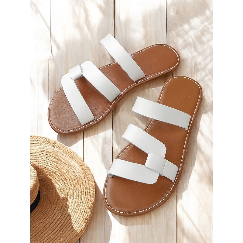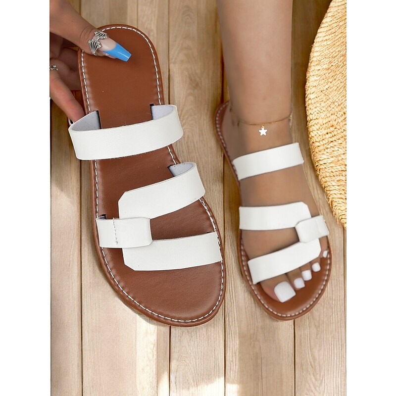 HOT ! Women's Black Faux Leather Strappy Flat Sandals – Minimalist Slip-On Summer Shoes for Casual, Beach, and Vacation Wear