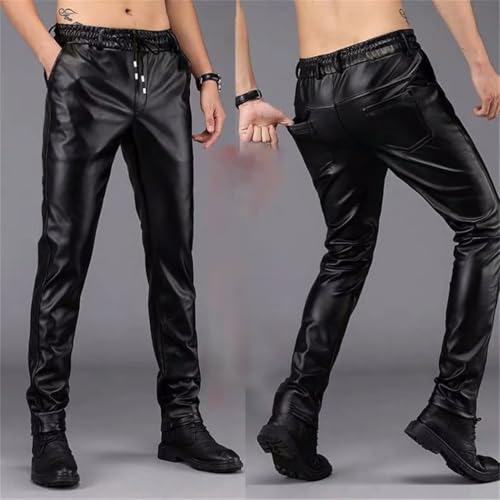 HOT ! FULBHPRINT Men’S Winter Fleece-Lined PU Leather Pants Stretch Slim Fit Thickened Motorcycle Riding Trousers with Tapered Legs