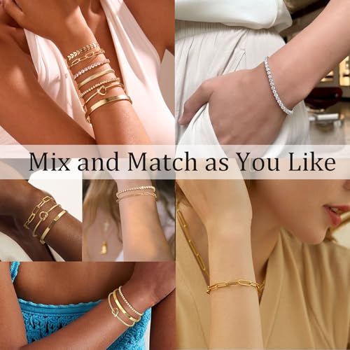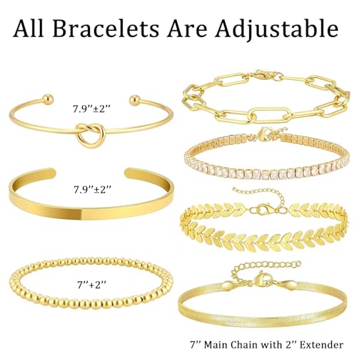 • 7 PCS Stackable Gold Bracelets Set: This gold bracelet stacks contain a Classic Tennis Bracelet, a Love Knot Bracelet, a Gold Cuff Bangle Bracelet, a Paperclip Bracelet, a Gold Beaded Bracelet, a Snake Chain Bracelet and a Gold Leaves Bracelet. Mix and match them as you like, whether wearing all together or separately