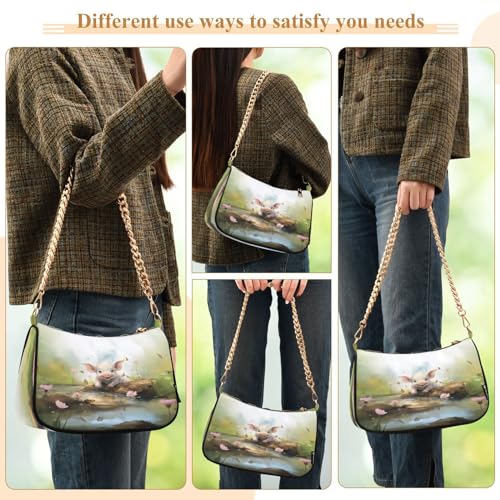 HOT ! Shoulder Bags for Women Pig with Pink Flowers in Creek Hobo Tote Handbag Small Clutch Purse with Zipper Closure