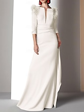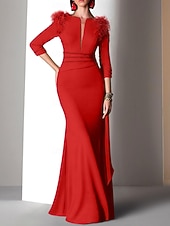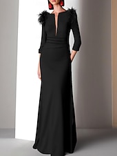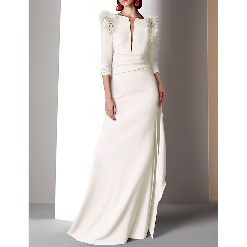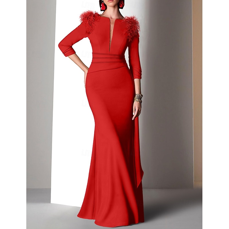 HOT ! Mermaid Wedding Guest Feather Dress Beach Wedding Evening Gown Elegant Formal Fall Floor Length 3/4 Length Sleeve V Neck with Ruched Ruffles dress to impress