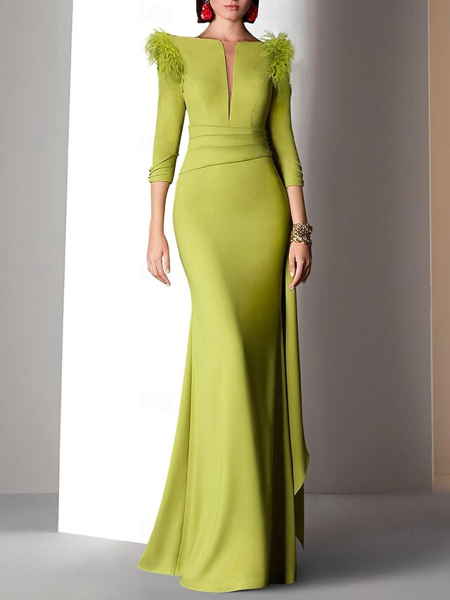 Mermaid Wedding Guest Feather Dress Beach Wedding Evening Gown Elegant Formal Fall Floor Length 3/4 Length Sleeve V Neck with Ruched Ruffles  dress to impress 1