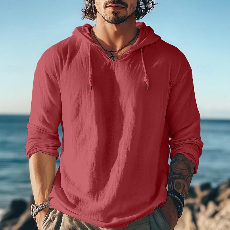More information about Men's Cotton Linen T Shirt Long Sleeve Hooded Summer Spring Fall Plain Basic Modern Casual Drawstring Basic Hooded Home Street Casual Pink White Blue Top Tee for Men