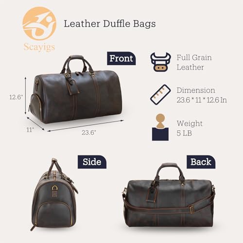 HOT ! Leather Duffle Bags for Men with Shoe Compartment – 23.6" x 12.6" x 11" Travel Bag, Gym Bag, Also Suitable for Crossbody or Shoulder Carry, Dark Brown Large Size