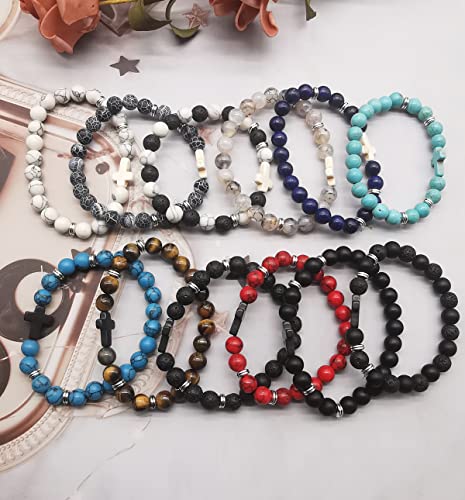12Pcs Fashion Religion Cross Men Women 8mm Natural Stone Lava Tiger Eye Stretch Anxiety Bracelets Unisex 7.5" 6