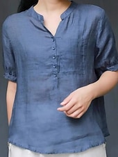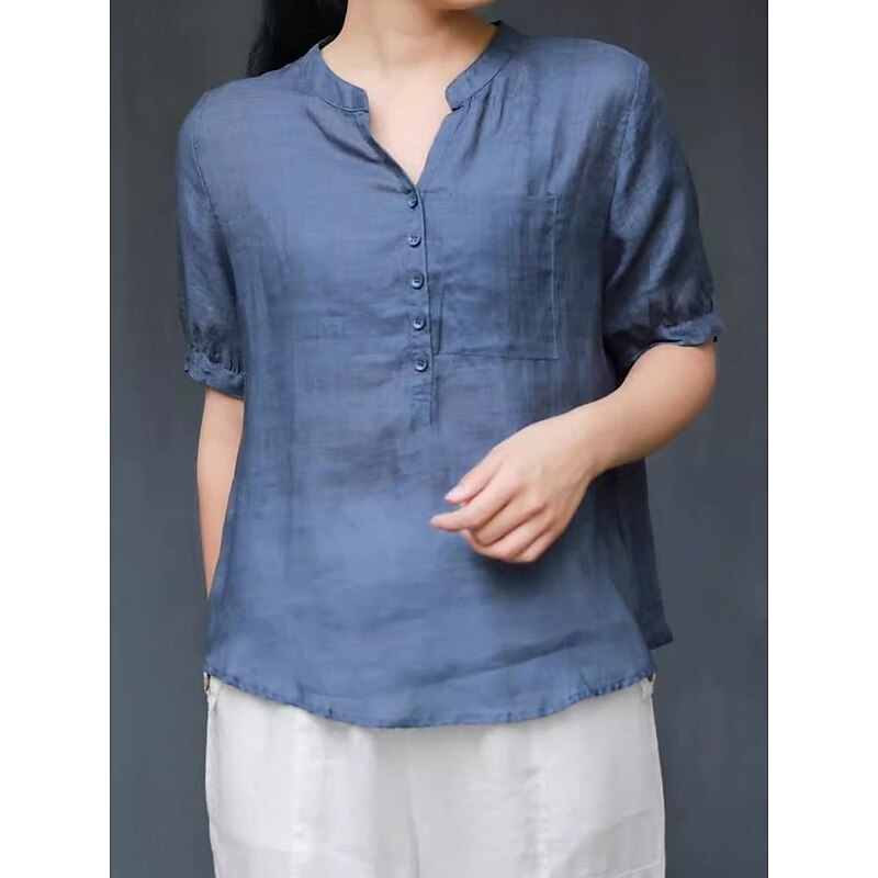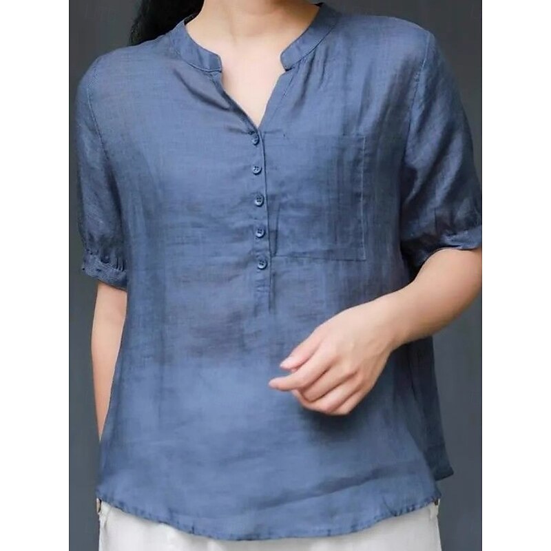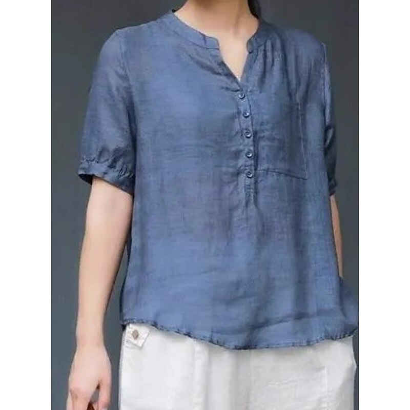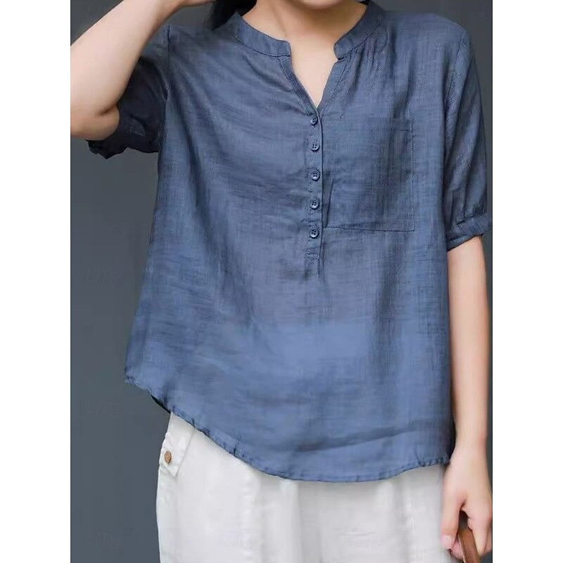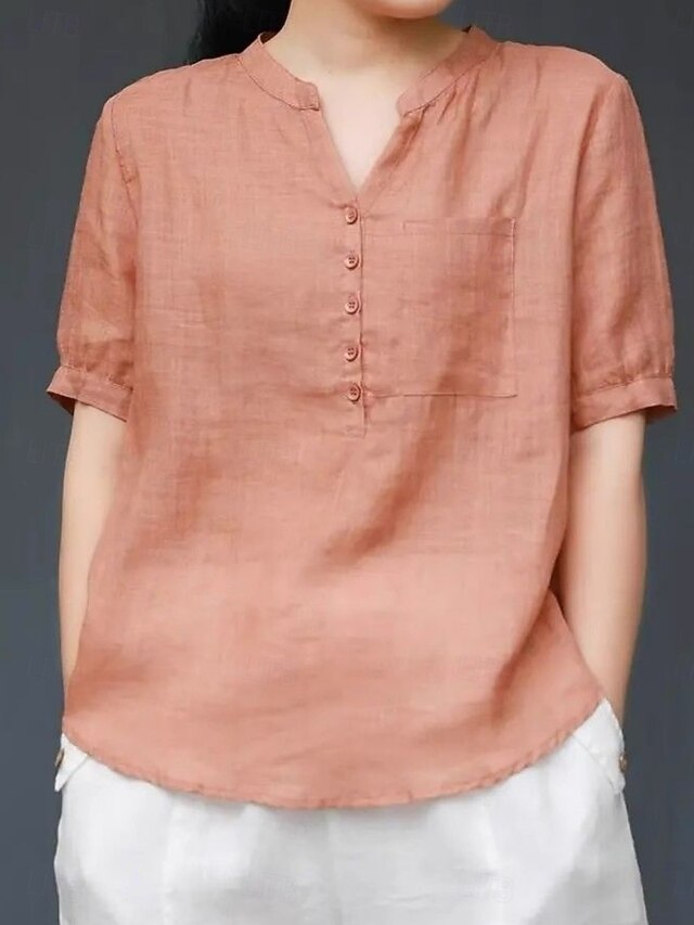 More information about Women's Shirt Blouse Cotton Linen Shirts Solid Color Basic Casual Short Sleeve Notched Neck Regular Tops Daily Buttons Pocket Navy Blue Orange Summer Spring