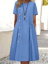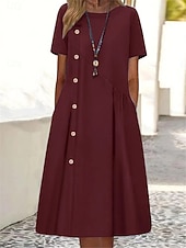 Highlights [Fabric] Crafted from high-quality polyester, this women's dress offers a breathable and lightweight feel. The micro-elastic fabric ensures a comfortable wear that is perfect for spring and summer days. [Silhouette] The dress boasts a flattering A-line silhouette that enhances the figure with a regular fit, providing ease of movement for all body types. Its mini dress length adds a touch of youthful charm to the overall look. [Design Highlights] Featuring a classic crew neckline and long sleeves, the dress includes an asymmetrical button design with contrasting buttons down the front, adding a stylish and unique element. Thoughtfully designed with discreet side pockets, it seamlessly combines style with functionality for a casual and relaxed vibe. [Occasions] Ideal for a variety of settings, this dress is perfect for sports, outdoor activities, or casual street events. Whether you're out for a weekend stroll or enjoying a leisurely afternoon, it offers effortless style and versatility for many occasions. [Size Range] Available in a range of sizes from S to 2XL, this piece accommodates different body types and preferences, ensuring a comfortable fit for everyone. With color options in Blue, Green, and Wine, you can choose the perfect hue to complement your wardrobe.