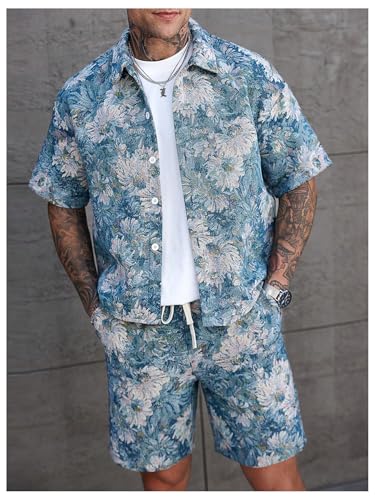 • Features: Mens two piece set, shirts and shorts set, floral print, short sleeve, button up, collar neck, drawstring waist
