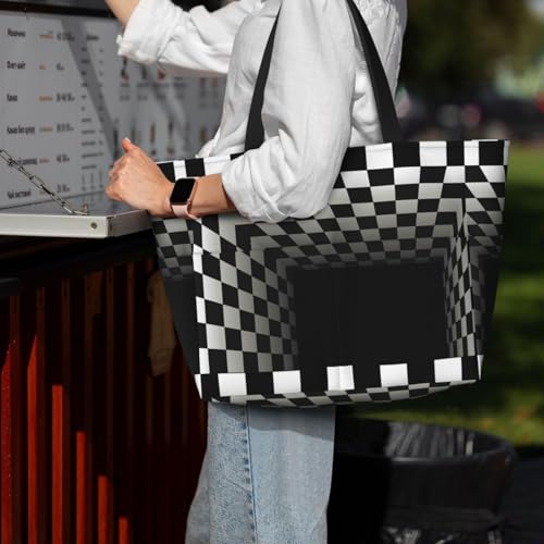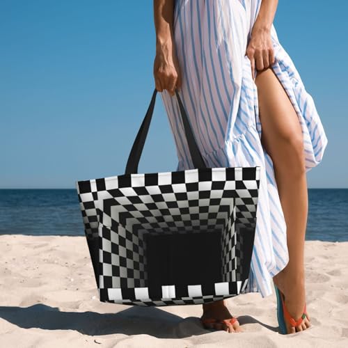 HOT ! 3d Black And White Checkerboard Tunnel Print Beach Pool Bags Tote For Women Ladies Large Gym Tote Carry On Bag For Weekender Travel Waterproof