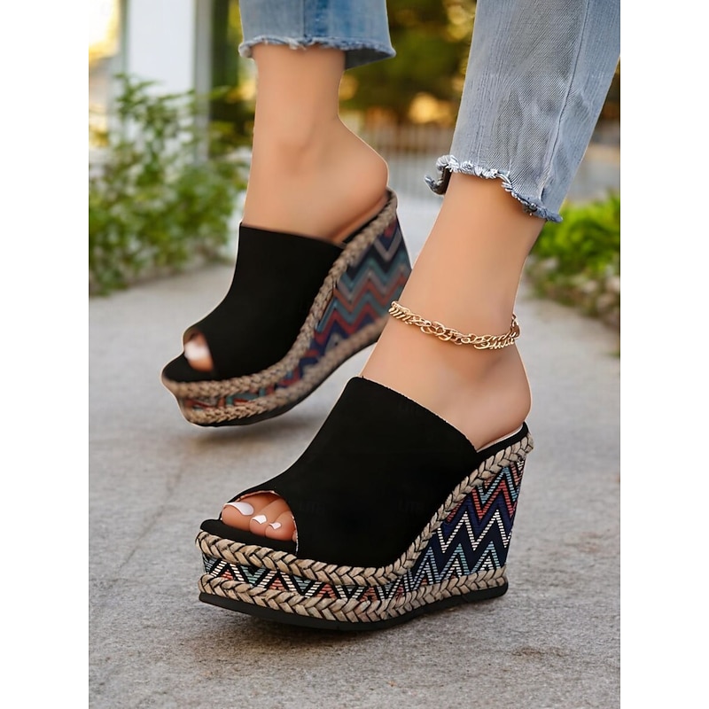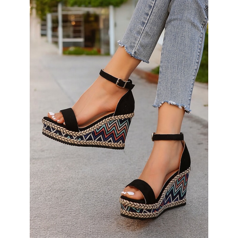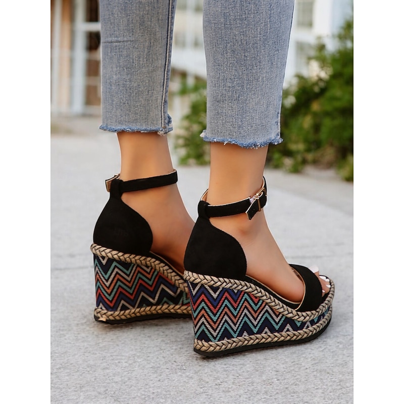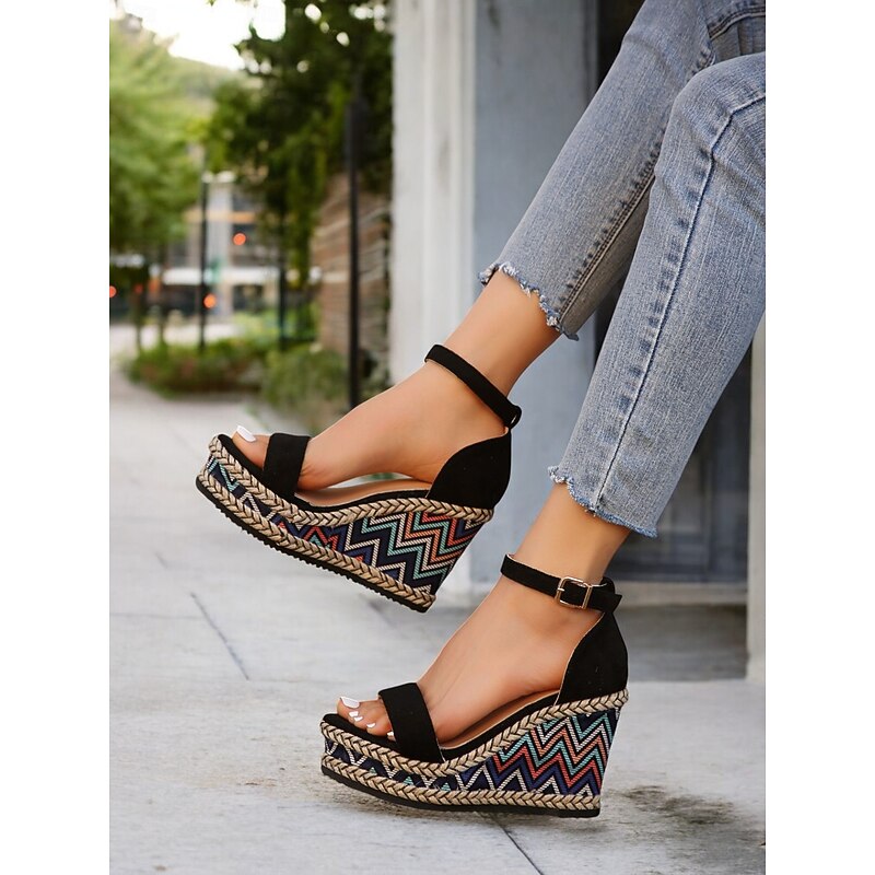 HOT ! Women's Ethnic Print Espadrille Wedge Sandals – Black Open Toe Platform Shoes for Summer Parties & Resort Outfits