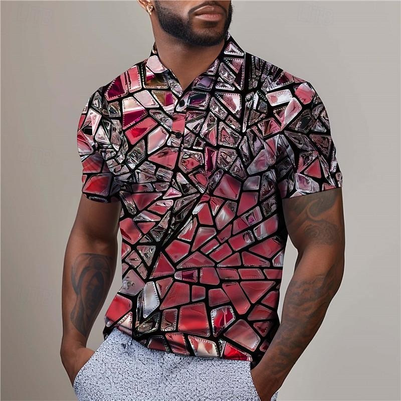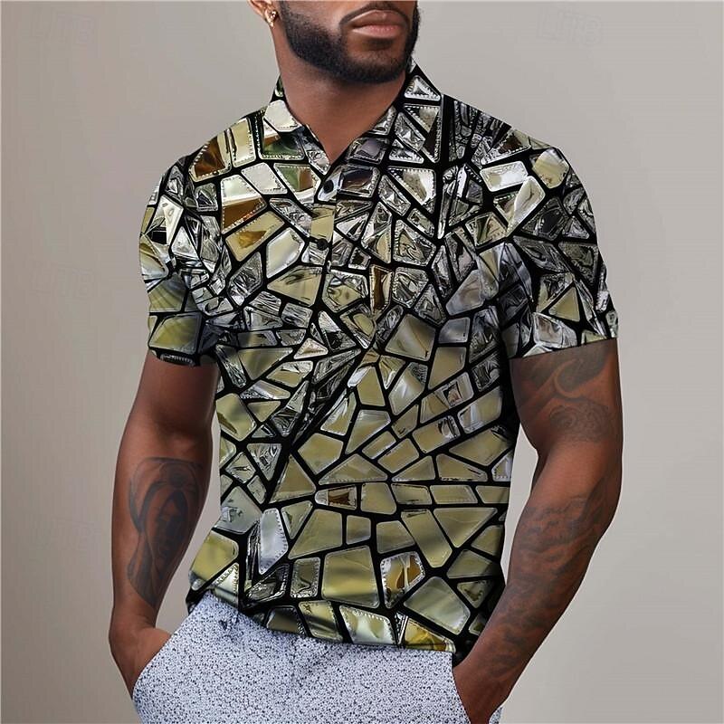 Highlights [Fabric] : Crafted from premium polyester, this men's polo shirt offers a lightweight and smooth feel. The fabric features a subtle micro-elasticity, providing both comfort and a modern silhouette. The 3D printed graphic pattern adds a vibrant touch, emphasizing its dynamic style. [Fit] : Designed with a tailored fit, this shirt ensures a flattering silhouette that complements the wearer's physique. The short sleeves and classic collared neckline enhance its sophisticated appeal, making it a versatile addition to any wardrobe. [Design Highlights] : The shirt boasts a striking geometric mosaic design in bold shades of silver, yellow, and red. The classic collar includes a buttoned placket, adding a touch of elegance. Its 3D print technology elevates the graphic details, delivering an eye-catching and contemporary look. [Occasions] : Ideal for vacation wear, rave events, or party outfits, this polo shirt transitions effortlessly from casual to semi-formal settings. Its bold pattern and vibrant colors make it a standout choice for any festive occasion. [Size Notice] : Available in a broad range of sizes from S to 3XL, this shirt is designed to accommodate various body types, ensuring a comfortable fit for adults.