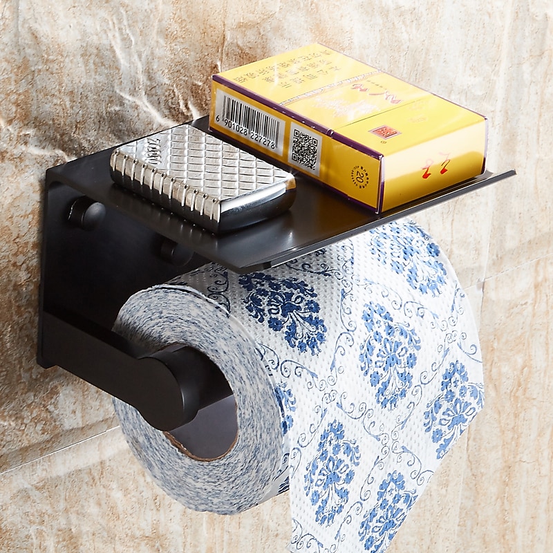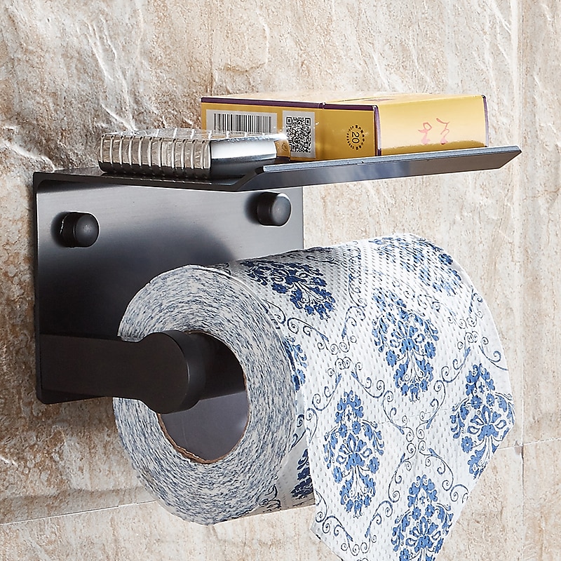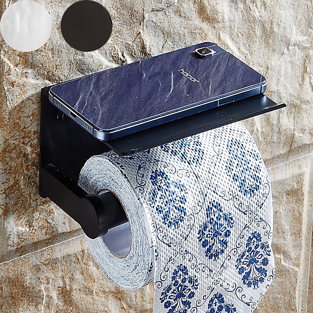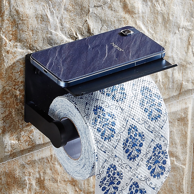 Aluminium Bathroom Paper Holder with Mobile Phone Storage Shelf Wall Mounted Roll Holder Black and Silvery 1pc 1