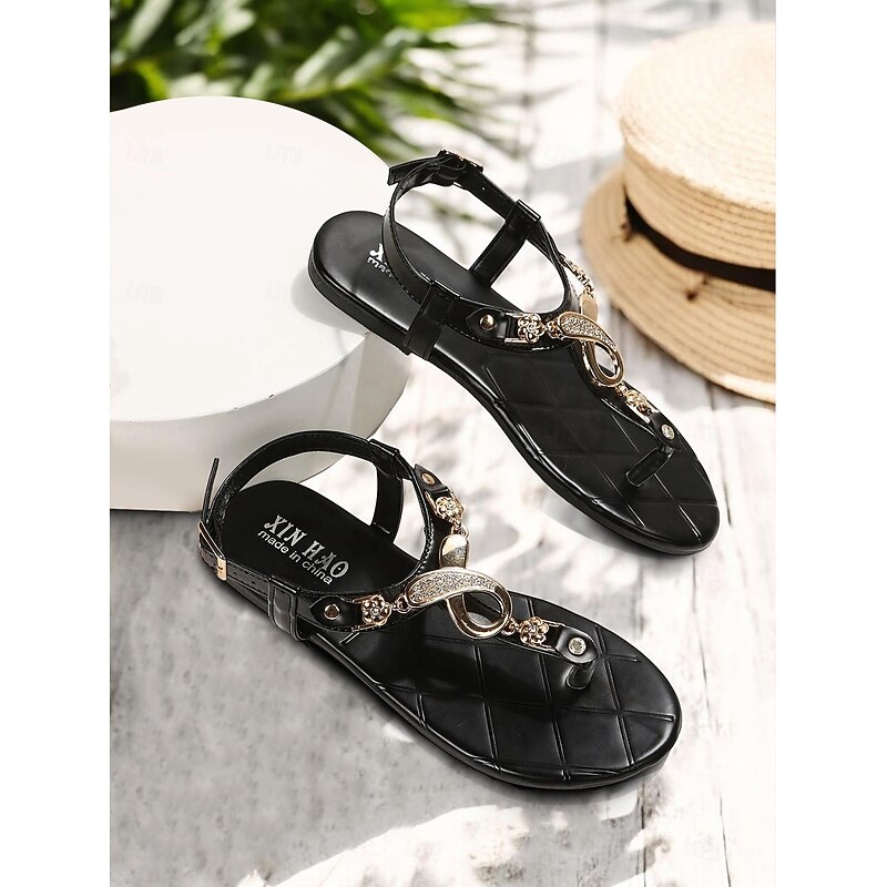 Women's Black Rhinestone T-Strap Sandals – Elegant Flat Summer Sandals for Casual, Beach, and Vacation Wear 14