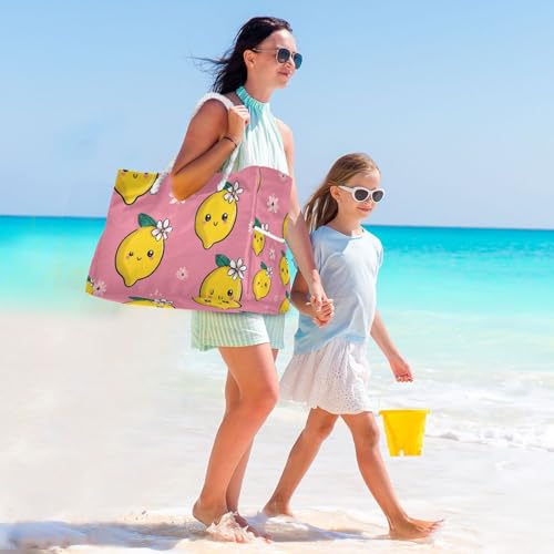 OTVEE Lemons and Pink Flower Pattern Beach Bags for Women Ladies Large Canvas Tote Shoulder Bag Waterproof Travel Bags for Gym Swim Pool Camping 6