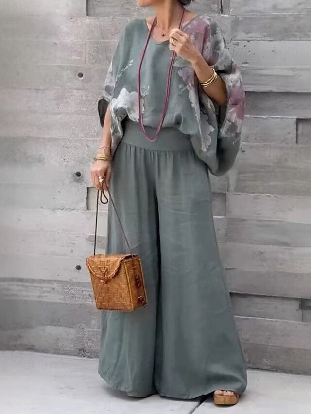 HOT ! Women's Active Cotton Linen Shirts Blouse Pants Sets Half Sleeve V Neck Printing Print Vacation Holiday Navy Blue Purple Brown Summer Regular Fit