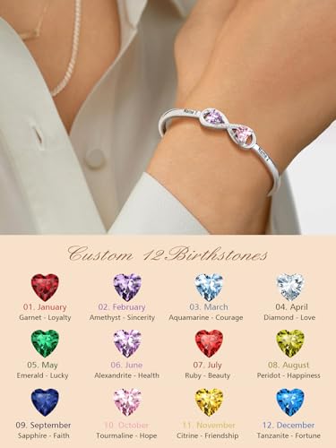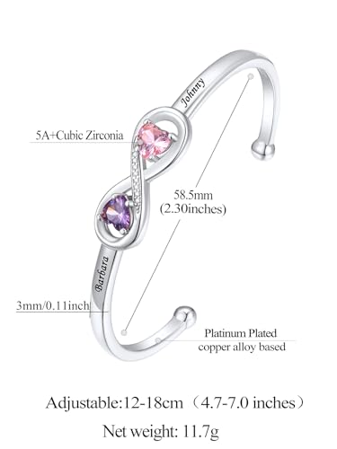 • This bling adorable infinity bracelet features 2 custom birthstones and names, adding a touch of fashion to any outfit. The adjustable size makes it the perfect gift for mothers and best friends. Customizable: Click "Customize Now", choose the 2 birthstone types and continue to choose the font, then input the names " You will get an unparalleled cuff bracelet.