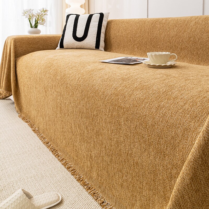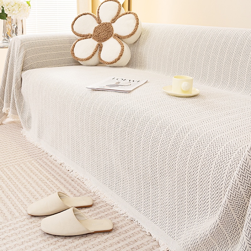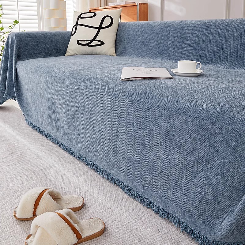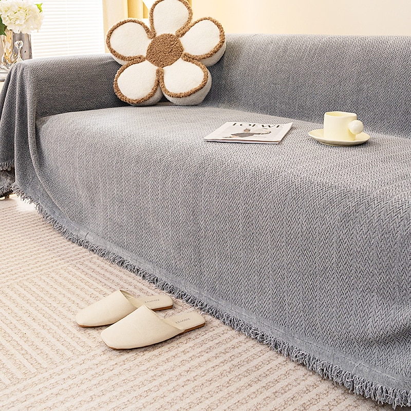 Highlights [Fabric] : Crafted from a high-quality blend of polyester and chenille jacquard, this sofa cover features a soft and durable fabric with a reactive print that ensures vivid and lasting color. The chenille material adds an extra layer of comfort and texture, making your seating area inviting and stylish. [Fit and Style] : Designed with a loose fit, the cover drapes beautifully over various sofa shapes and sizes, offering a relaxed yet sophisticated look. The plain, solid color design complements any decor theme, while the subtle chevron pattern introduces a touch of elegance and modernity to your living space. [Design Highlights] : This sofa cover is adorned with intricately finished fringes along the edges, which enhances its casual charm and adds a touch of bohemian flair. The reactive print method not only guarantees vibrant colors but also ensures the long-lasting durability of the fabric. [Versatile Uses] : Perfect for protecting your furniture from dust, wear, and pet hair, this sofa blanket is ideal for households with pets or kids. It refreshes the look of your living room, making it suitable for everyday use or special occasions, such as family gatherings or casual evenings. [Size Availability] : Available in a variety of sizes, including 180x130cm to 180x420cm, this cover accommodates a wide range of sofa dimensions, ensuring a great fit for most couch configurations. This versatility allows you to find the perfect size for your sectional, loveseat, or traditional sofa.