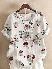 More information about Women's Shirt Blouse Cotton Linen Shirts Floral Casual Short Sleeve Crew Neck Regular Tops Vacation Daily Buttons Print White Summer