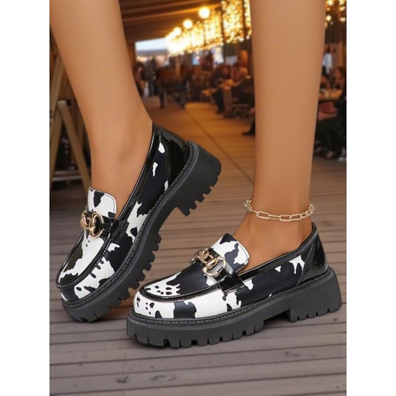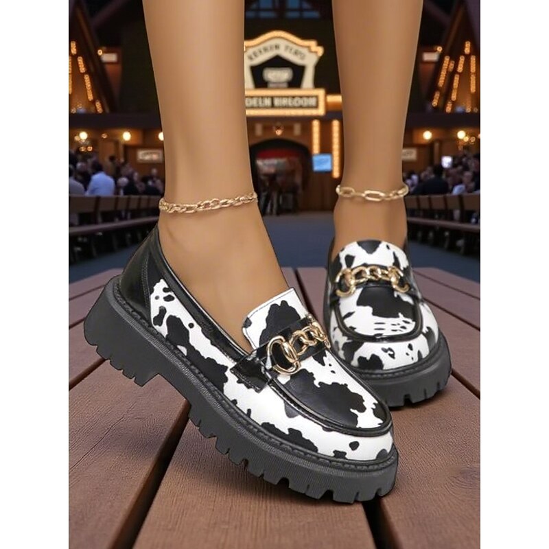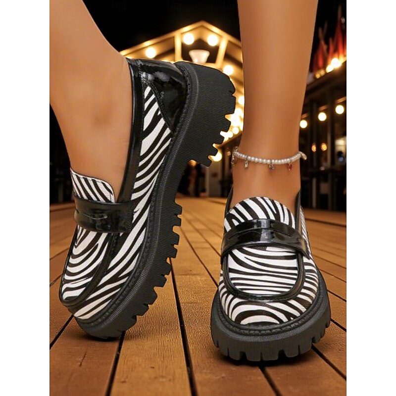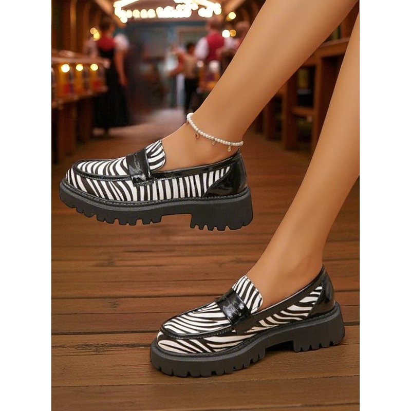 HOT ! Women's Zebra Print Loafers – Chunky Platform Slip-On Shoes with Gold Chain Detail, Bold Animal Print Fashion Flats for Casual Outfits, Streetwear and Oktoberfest
