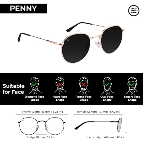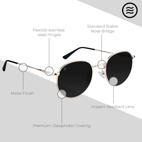 • Sleek Design: Featuring a gold metal-finish frame black lenses, our polarized glasses with 5.42% transmission reduce glare and enhance clarity; these round black sunglasses for women and men take you back in time with our retro-inspired style