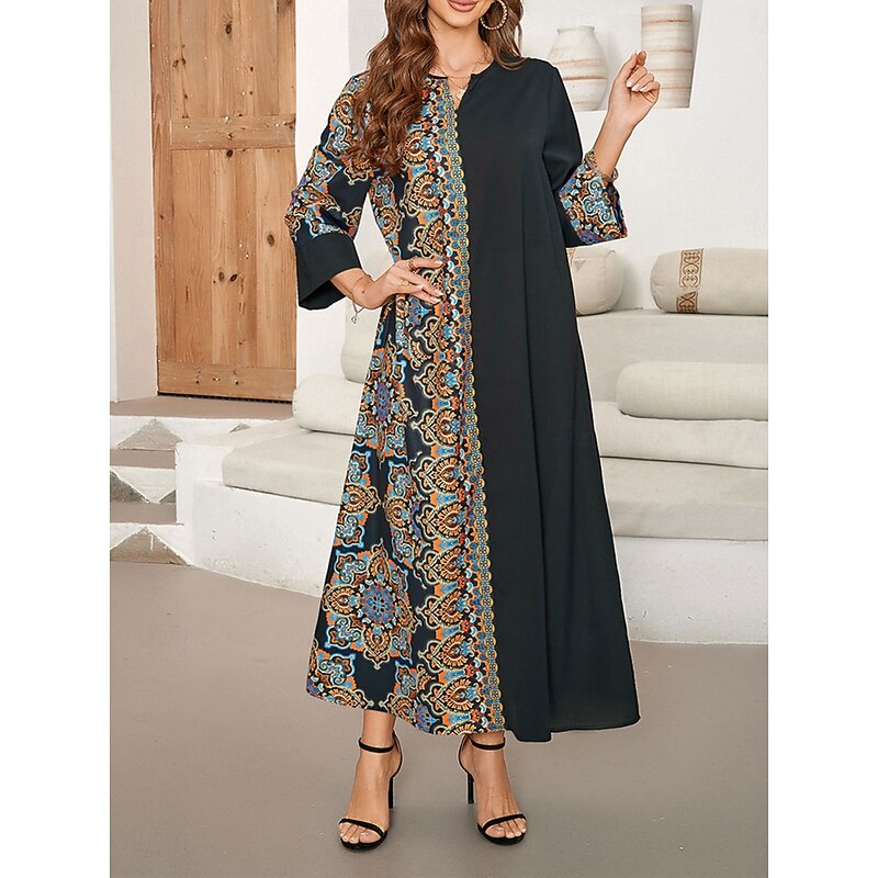 Highlights [Fabric] : Crafted from high-quality polyester, this women's dress offers a lightweight, breathable experience, ensuring comfort and ease for day-to-day wear. The fabric’s micro-elastic properties provide a soft fit, enhancing the casual feel. [Silhouette] : Featuring a loose, flowy A-line silhouette, this dress enhances its relaxed appeal while allowing freedom of movement, making it ideal for those who favor comfortable yet stylish attire. [Design Highlights] : The sophisticated notched neck design complements the dress's dual-pattern aesthetics. One side is adorned with an intricate geometric floral print in vibrant shades of blue, orange, and gold, contrasted by a solid black side that allows the colorful pattern to stand out. The three-quarter sleeves extend the patterned design to the cuffs, highlighting the thoughtful design elements. [Occasions] : This versatile maxi dress is perfect for a variety of settings, from daytime outings to evening gatherings. Its elegant yet comfortable style makes it suitable for daily wear throughout the spring and fall seasons. [Size Options] : Available in a range of sizes including S, M, L, XL, and 2XL, accommodating different body types to ensure a flattering fit for everyone.