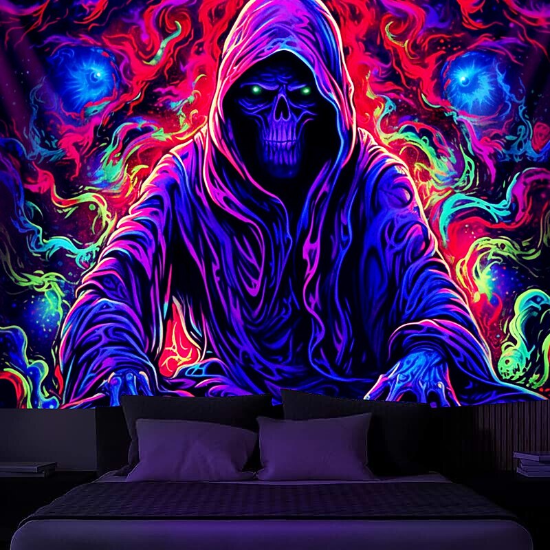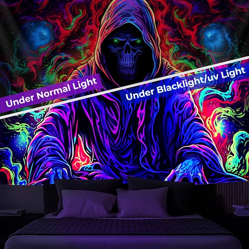Highlights 【Durable Construction】 Crafted with high-quality polyester fabric, this tapestry is built to last. Its robust composition ensures that you can enjoy its beauty for years to come. 【Soft and Lightweight】 This tapestry is soft to the touch and lightweight, making it perfect for both indoor and outdoor use. 【Multiple Size Options】 Available in different sizes to accommodate any room's dimensions. 【Intricate Design】 The tapestry features a captivating design inspired by life itself. Its vivid imagery, crisp lines, and vibrant colors will become a conversation piece in any room. 【Versatility at Its Best】 Not just for wall decor, this tapestry can also double as a tablecloth or a picnic blanket, adding functional versatility to its artistic charm. 【Note】 1. Please allow 1-2cm (0.4"-0.8") deviations due to manual measurement. 2. Please understand the tiny color vary from the product due to different light and screen display. 3. UV/Black Light Reactive: This glow in the dark tapestry glows under blacklight / UV light. In normal light, the colors also are full and vivid.