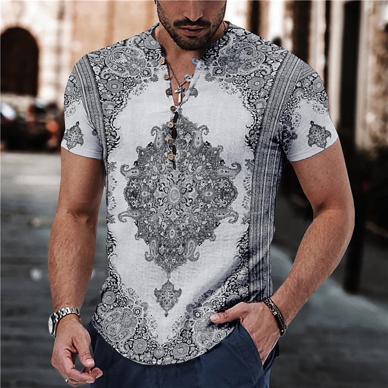More information about Men's Floral Tribal Vintage Shirt Linen Shirt Button Up Shirt Short Sleeve Fashion Streetwear Designer Outdoor Casual Daily Spring & Summer Stand Collar Print Pink Blue Green Khaki Gray