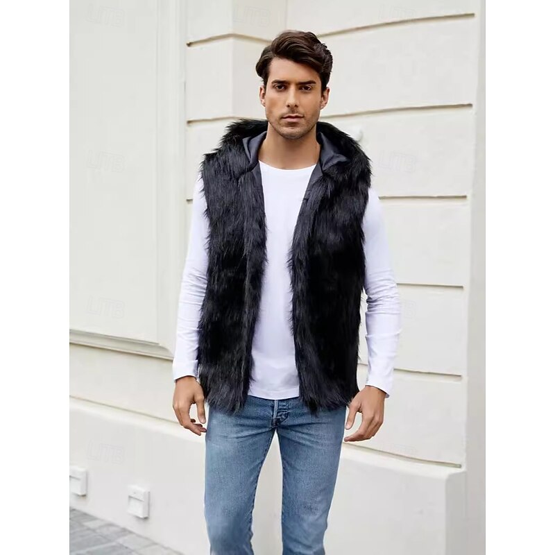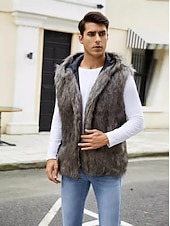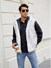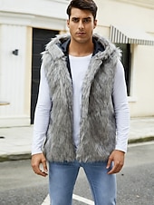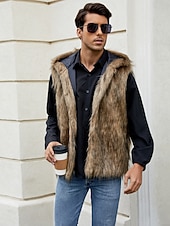 More information about Men's Fleece Vest Hoodie Vest Faux Fur Vacation Casual Daily Wear Going out Fashion Basic Fall Spring & Fall Hooded Acrylic Faux Fur Comfortable Plain Zipper V Neck Regular Fit Black White Brown