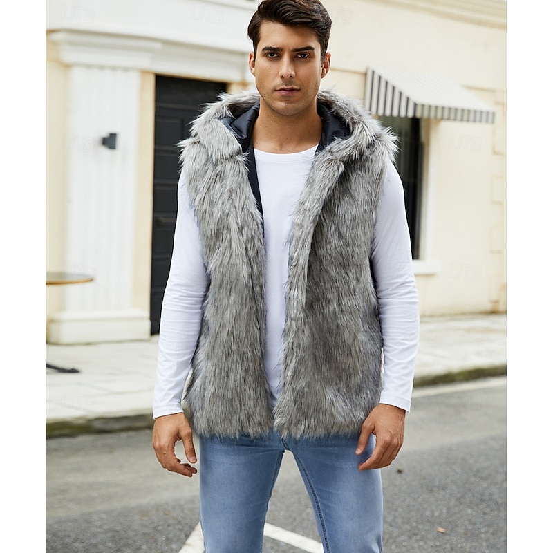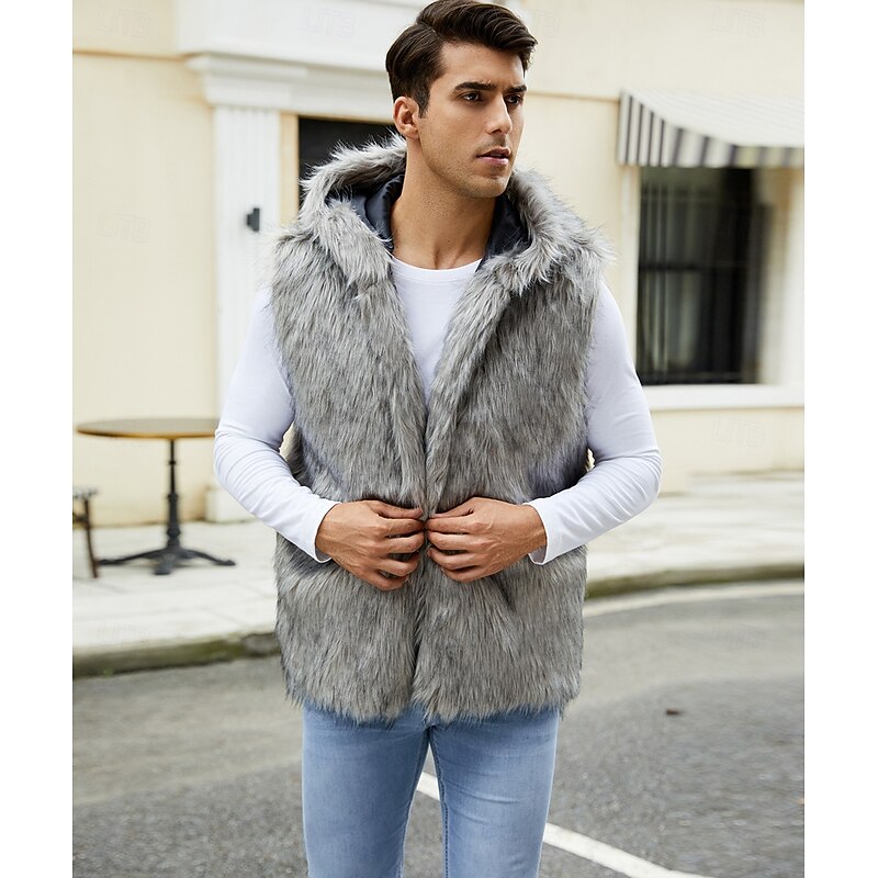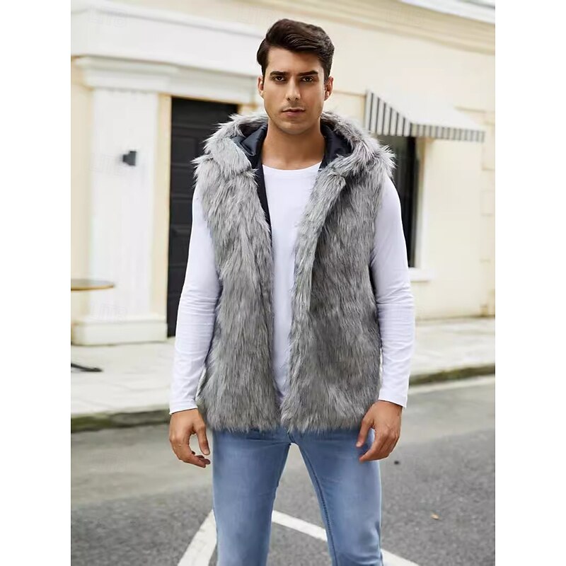 Men's Fleece Vest Hoodie Vest Faux Fur Vacation Casual Daily Wear Going out Fashion Basic Fall Spring &  Fall Hooded Acrylic Faux Fur Comfortable Plain Zipper V Neck Regular Fit Black White Brown 11