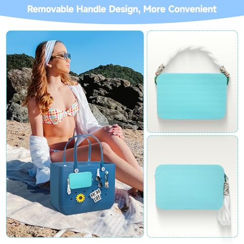 • Widely Applicable: This silicone phone holder attachments for Bogg Bag is large enough for 2 iPhone Pro Max devices and some small items favor jewelry, keys, lipstick, sunscreen, etc. The phone case holder bag comes with a detachable handle, allowing you to attach it to your bag or wear it on your wrist. It is suitable for outdoor use at the beach, pool, or anywhere you need user-friendly access to your phone at any time.