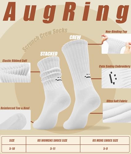 Fabric type: 84% cotton, 5% nylon, 3% polyester, and 8% spandexCare instructions: Machine WashOrigin: ImportedPattern: SolidPremium Fabric: Our women’s scrunch crew socks are crafted from a premium blend of soft cotton, durable nylon, and stretchy spandex—delivering long-lasting comfort, flexibility, and strength. Reinforced toes and heels add extra support, making them ideal for everyday wear.Retro Vibes: Designed to fit women’s US sizes 5–11 and men’s 5–9, these cute retro-style socks blend timeless comfort with a nostalgic 80s vibe. The thick white knit features cushioned toes and soles to absorb impact and reduce friction as you move.Active Appeal: These athletic-inspired slouch socks offer the perfect balance of soft cushioning and breathable comfort—ideal for women on the go. Whether you're working out, running errands, or just relaxing, they provide dependable support. A cute smiley face on the back of the ankle brings a fun and kawaii twist to the sporty vibe.Everyday Style: Add a cute and casual touch to your outfit with our women’s slouchy crew socks, available in white, black, gray, porpoise, beige, and brown. The relaxed slouch fit and iconic crew length offer laid-back comfort and easy styling.Winter Cozy: Keep cozy with our Women's Crew Thick Boot Socks during chilly winter months. Designed for warmth and comfort, they're ideal for indoor and outdoor wear, ensuring your feet stay snug, in any setting. Perfect for everyday use. top-grade materials and excellent craftsmanship ensure long-lasting durability.