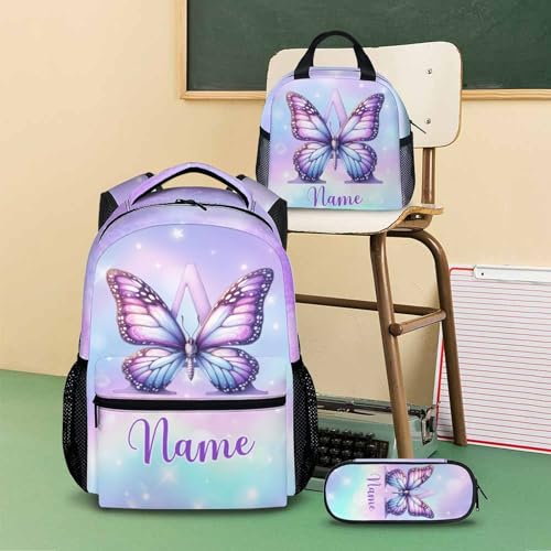 Custom Design: Our talented designer has created eye-catching patterns, adding a one-of-a-kind addition to your backpack. Looking for a personalized present? Customize your backpack with your name or text, making it a thoughtful present for yourself or someone special. Kids butterfly backpack and lunch box, pencil case all can customize a name/text, we will make a personalized name schoolbag for youA Wonderful Present: 3pcs set with lunch box and pencil case, with vibrant colors is great for school students daily use, school outdoor travel bag. Kids bookbags set including backpack for elementary, insulated lunch bag and pencil case. The insulated lunch tote bag is big enough for your lunch box, fruit, a cup of yogurt, salad or a bottle of drink. The pencil case with special design and big enough for pencils, keys and other small school essentialsEasy to Orangize: Butterfly patterns print backpack provides roomy space for storage. Most of daily necessities can be loaded, such as folder, water bottle, notebook, lunch box, extra clothes, etc. Plus, there are 2 mesh side pockets used as water bottle holder. Those different compartments and pockets will help keep you organizedRoomy: Approximate Dimensions of the Backpack: 12 L x 5.4 W x 17 H. 3Pcs Backpack Sets Size: 12 L x 5.4 W x 17 H; Lunch Box: 9.7 L x 5.7 W x 7.8 H; Pencil Case: 8.6 L x 3.9 H. Our 17inch girls backpack for school can take in clothing, books, keys, daily necessities and more. Pockets on both sides can store your umbrella or water bottle. Suitable for school, travel, sport, picnic, camping, shopping, cycling, gym, daily lifeLightweight & cozy: The monogram letter backpack is made of premium polyester which is lightweight and easy to clean. The handle, shoulder straps and back are padded, adjustable padded shoulder straps, comfortable to wear, great choice to be used as a travel backpack, daypack Perfect for everyday use. top-grade materials and excellent craftsmanship ensure long-lasting durability.