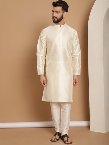Fabric type: Dupion Art SilkCare instructions: Machine WashOrigin: ImportedBEAUTIFUL HANDLOOM KURTA PAJAMA SET : This is a 2-pieces set that includes long kurta and a drawstring pajama. Traditional design on this kurta captures all of the details of the classic Indian men's garment with long sleeves, a long hemline with side vents and a mandarin collar.COMFORTABLE FIT: Sizing is designed for a regular relaxed fit. Available size chest S(38), M(40), L(42), XL(44). Please see the size chart in description or image section before ordering.HIGH QUALITY MATERIAL: Lightweight and breathable material gives this kurta pajama set soft, comfortable feel. Made from the finest handloom dupion art silk fabric. The kurta is lightweight with vented side. Designs feature modern and innovative details that appeal to everyone.BEAUTIFUL AND HANDMADE: This kurta pajama set is fully handmade by finest artisans of north India. The entire garment is made by a single artisan instead of chain-system production. Recommended use of this vintage and comfy cotton linen caftan for men is suitable for daily life, outdoors, home, Summer, vacation, party, festival, costume, etc.Style: A breathable and stylish clothing, suits for a classic look. It is a birthday, anniversary, wedding, Navratri, Durga Puja, Diwali or any occasion perfect present gift for your dad, husband, son, or friend. Perfect for everyday use. High quality materials and excellent craftsmanship ensure long-lasting durability.