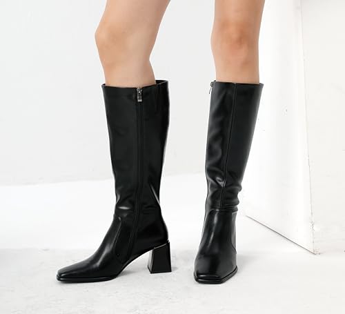Women's Knee High Boots Block Metal Heel Square Toe Side Zipper Soft PU Leather Classic Fashion Dress Long Boots 4