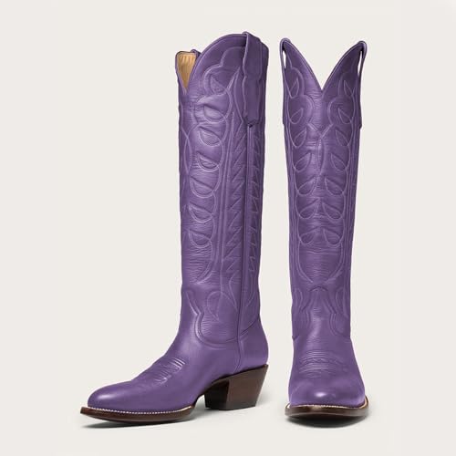 Cowboy Boots for Women Knee High Cowgirl Boots with iconic Embroidered Slip On Round Toe Chunky Heel Pull On Fashion Retro Tall Boot