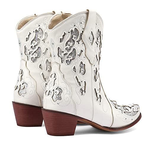 FIFSY Rhinestone Mid Calf Cowboy Boots Sequin Glitter Chunky Heel Booties Short Western Cowgirl Vintage Boots