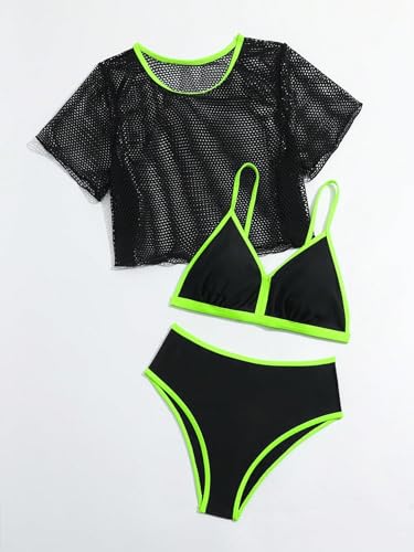 Why Choose WDIRARA Girl's 3 Pieces Color Block Contrast Trim Bikini Set Swimsuit with Mesh Cover Up Top?