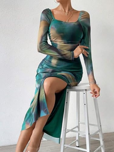 LIGHT DOT Women's Printed Off Shoulder Dress Long Sleeve Bodycon Maxi Mesh Layered Side Slit 4