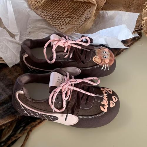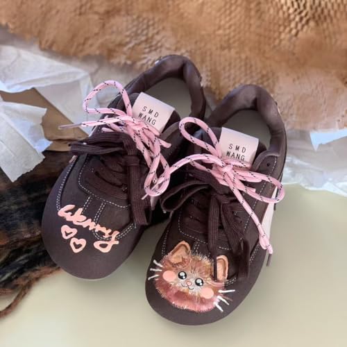 • DESIGN FEATURES: Brown casual sneakers with adorable cat artwork and hearts design, complemented by trendy pink laces for a cute, feminine look