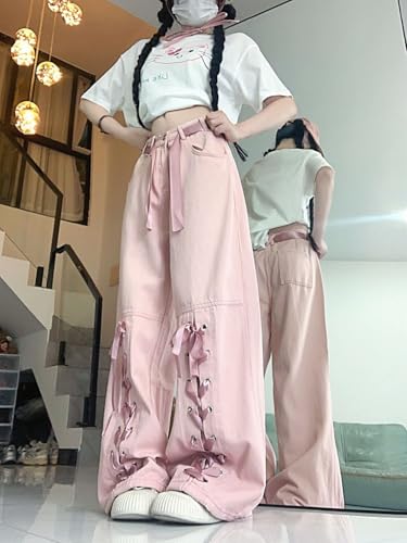 More information about Y2K Bow Tie Jeans for Women Baggy Casual Wide Leg Pants Kawaii Straight High Waist Drawstring Pink Trousers
