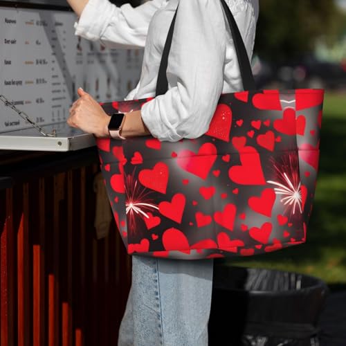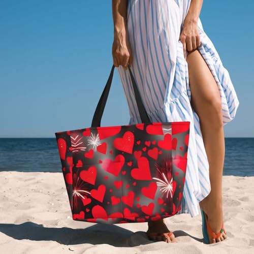 sizzling ! Red Hearts Firework Extra Large Tote Bag For Women,Foldable Beach Bag With Pocket Weekender Travel Overnight Bag