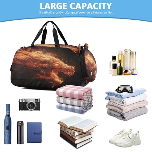 YETTASBIN Sport Travel Duffel Bag for Girls Boys, Fire Dragon Large Waterproof Weekender Overnight Bag, Detachable Shoulder Strap Gym Bag with Shoe Compartment & Wet Pocket 7