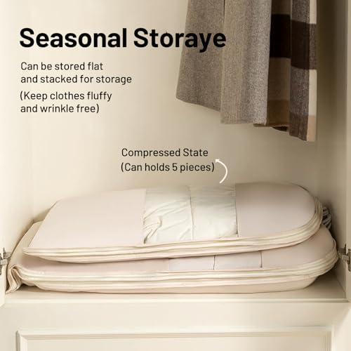 Space Saving Hanging Compression Garment Bag with Zipper for Closet Storage, Hanging Clothes Storage Bag, Garment Covers for Coats and Down Jackets, Beige, XL
