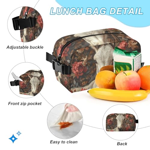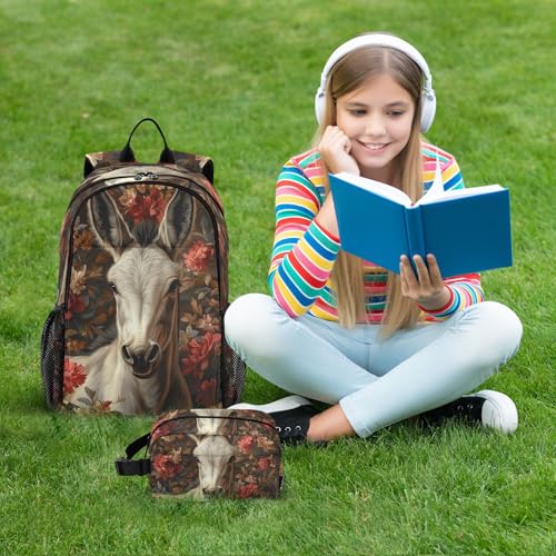 Animals Kids Backpack White Donkey Flowers School Bookbag with Lunch Bag for Boys Girls Preschool Kindergarten Elementary Laptop Daypack